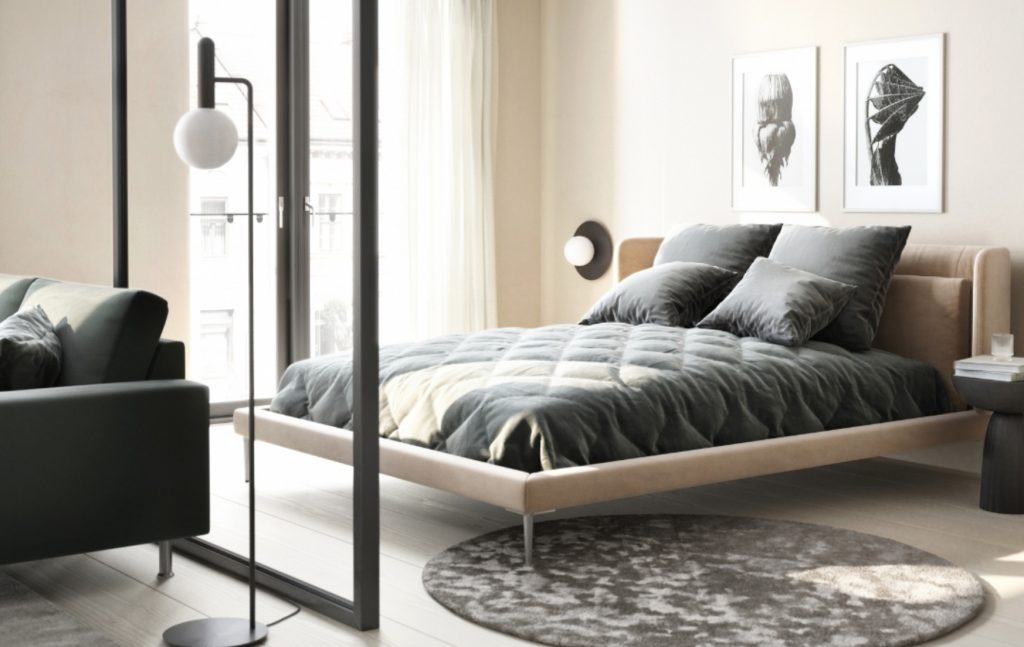 La cama Austin de BoConcept define el espacio con detalle de diseño, como las patas de aluminio y el cabecero de madera contrachapada con tapizado a elección.