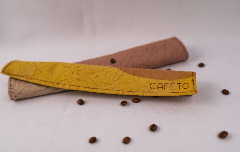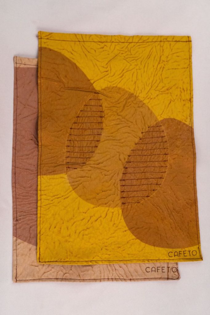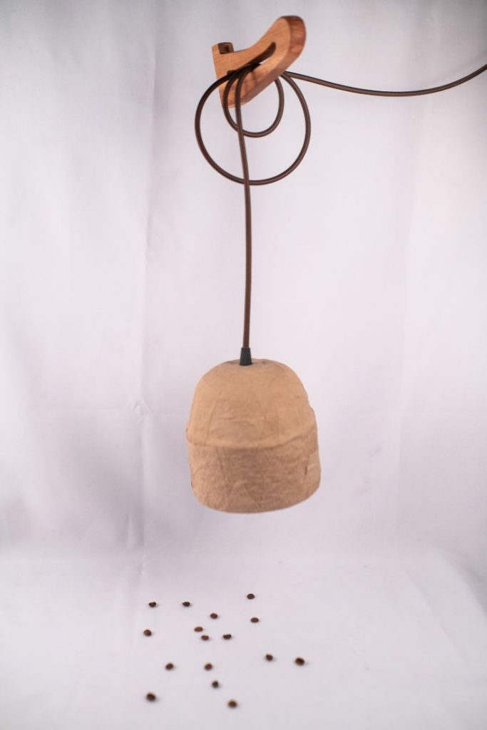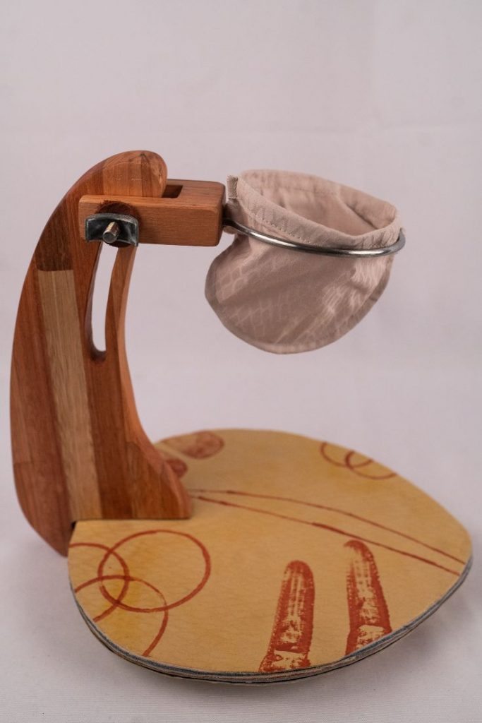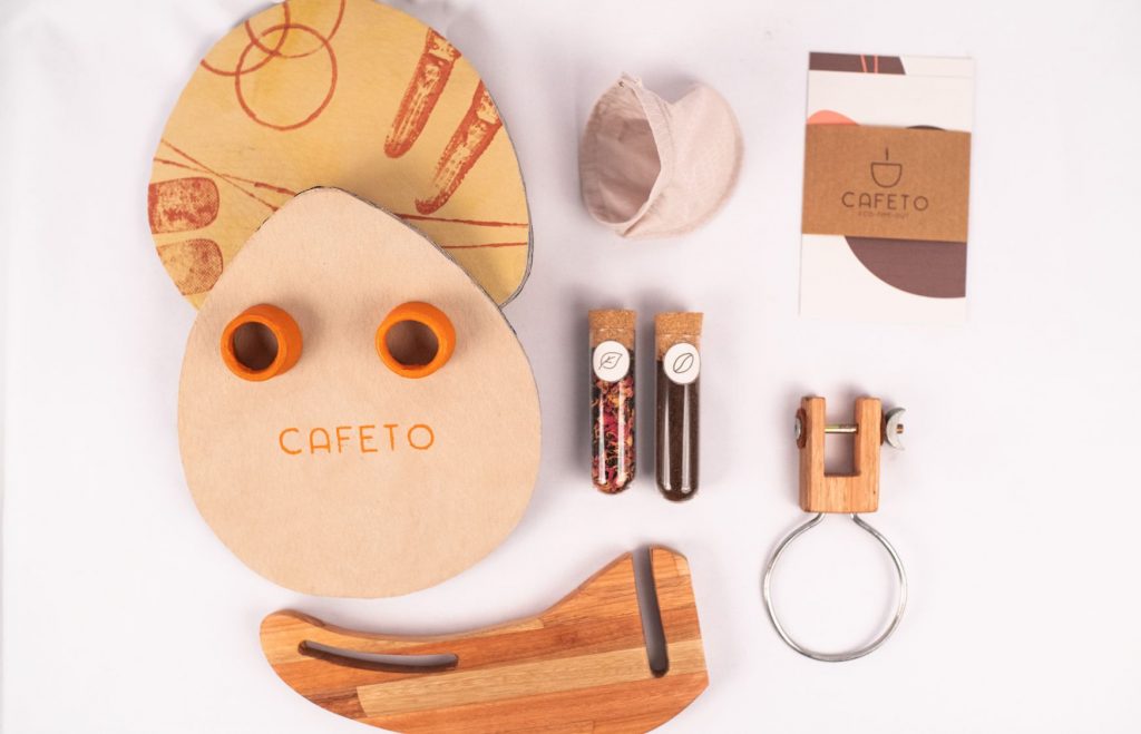 Cafeté: Este dispositivo esta diseñado para que colocando el filtro en la altura máxima, el usuario pueda prepararse un café y en la altura mínima, un té. Su base es de desechos textiles con resina ecológica y sus piezas de madera son desechos también, madera recuperada.