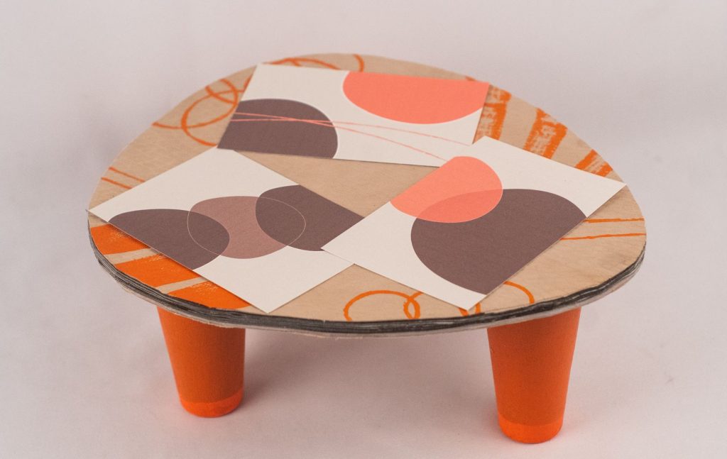 Dispositivo de apoyo Arábica: Esta superficie de apoyo está diseñada con deshechos textiles de diferentes características, con la altura ergonómica para colocar pequeños objetos como libretas, celulares o hasta alguna planta en maceta.